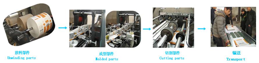 卷料 → 過料 → 分層 →中上膠 →成型→多層牽引→ 切斷(定長短)→拉斷 → 光電計(jì)數(shù) → 整袋輸送 → 成品。